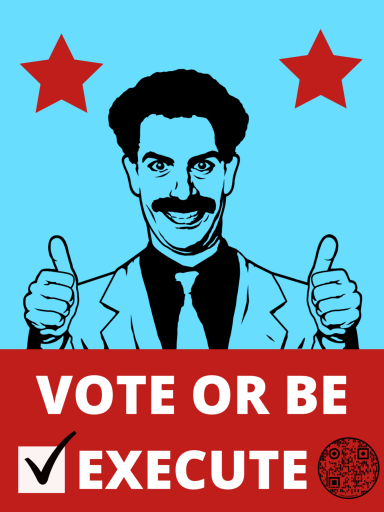 Bring your ideas for agitprop, such as the Borat poster that was done by Dr. Ron in 2020 to encourage voter turnout among students.
